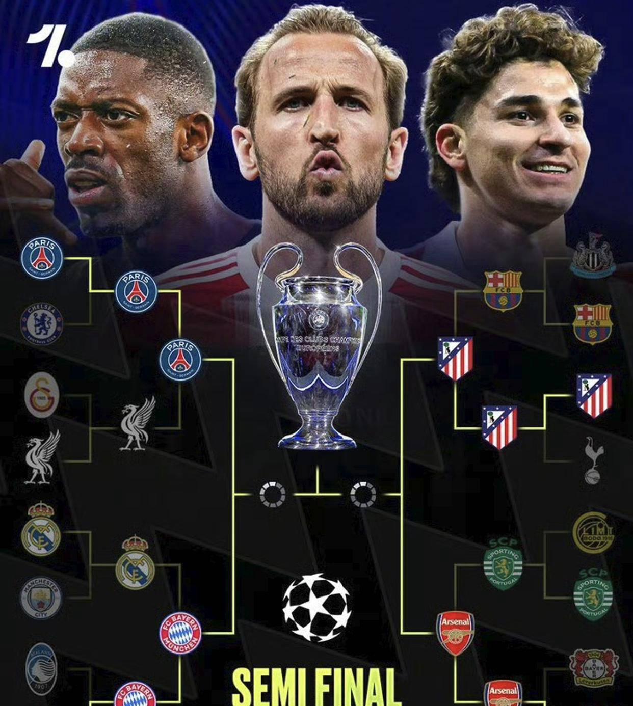 欧冠四强,已经决出两个名额,卫冕冠军巴黎圣日耳曼,携手西甲劲旅马德里竞技,成功晋级。随后还有两场比赛,首回合均为一球领先的拜仁慕尼黑,以及阿森纳,能否顺利来到半决赛呢?
