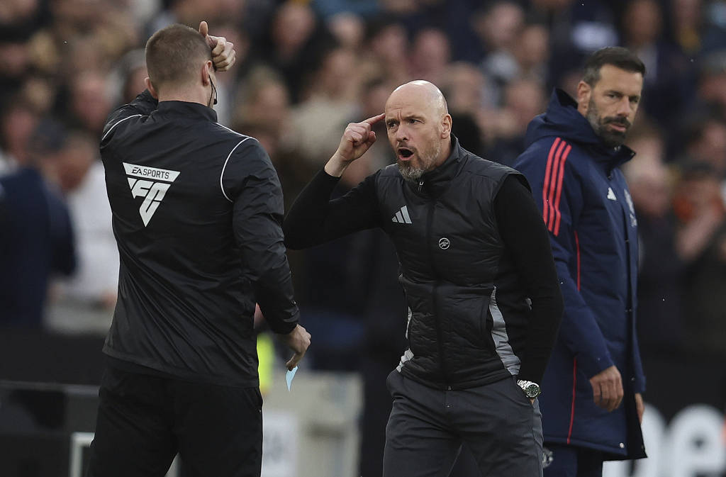 当地时间2024年10月27日,英国伦敦,24/25英超第9轮,西汉姆联Vs曼联,球场边的滕哈赫。视觉中国 图